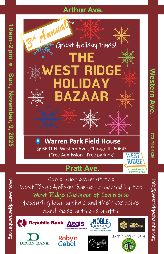West Ridge Holiday Bazaar 2025 - This third annual festive shopping event will feature local artists and their exclusive hand made arts and crafts! We’ll also feature live music by local musicians from the West Ridge community. FREE to enter! Sun., Nov. 9, 2025 - 10am to 2pm Warren Park Fieldhouse, 6601 N Western Ave. Chicago, IL 60645 FREE parking!!! #westridgechicago #westridgechamberofcommerce #shoplocal